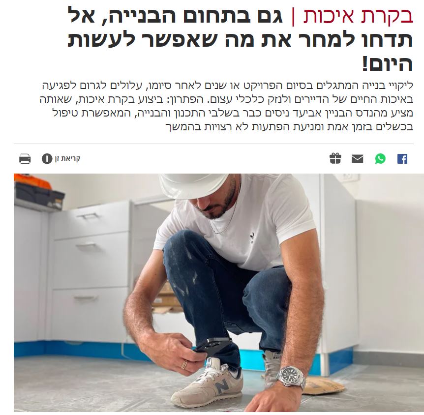 ליקויי בנייה המתגלים בסיום הפרויקט או שנים לאחר סיומו, עלולים לגרום לפגיעה באיכות החיים של הדיירים ולנזק כלכלי עצום. הפתרון: ביצוע בקרת איכות, שאותה מציע מהנדס הבניין אביעד ניסים כבר בשלבי התכנון והבנייה, המאפשרת טיפול בכשלים בזמן אמת ומניעת הפתעות לא רצויות בהמשך